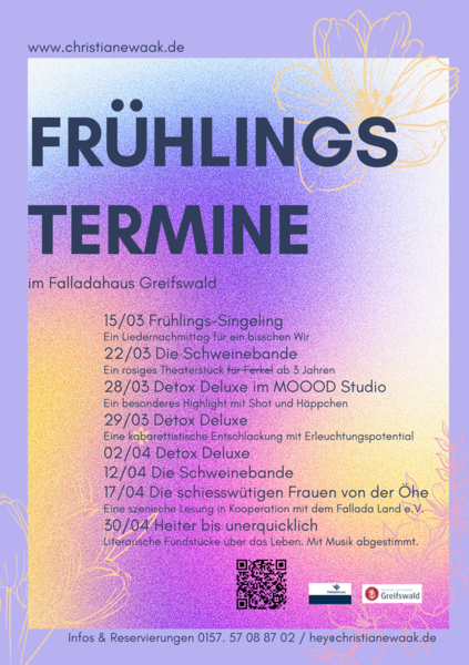 Szenische Lesung mit dem Falladaland e.V. Eine bewegende Verknüpfung aus dem Fallada Roman, Originaltexten der Schilling Schwestern und überlieferten Erinnerungen. Mit Boris Ben Siegel am Text, Cornelia Graumann im Performdance und mir. 18 Euro |