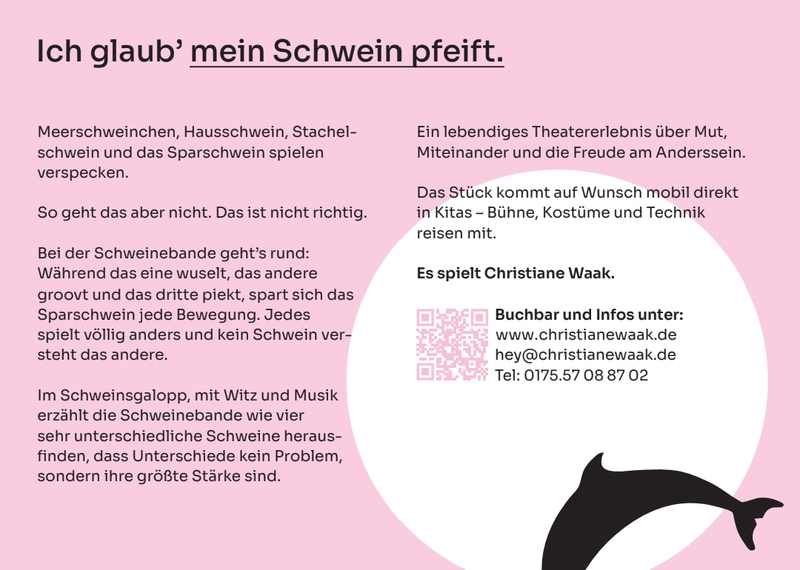Im Schweinsgalopp, mit Witz und Musik erzählt die Schweinebande, wie vier sehr unterschiedliche Schweine herausfinden, dass Unterschiede kein Problem, sondern ihre größte Stärke sind.